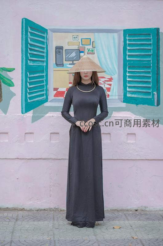 一位头戴斗笠、身着黑色长裙的女子静静站立在绘有窗户壁画的粉色墙壁前,造型简约而充满艺术感,仿佛从画中走出的东方美人。