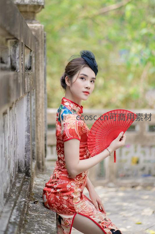 红裙佳人持扇倚古墙,温婉回眸展东方神韵
