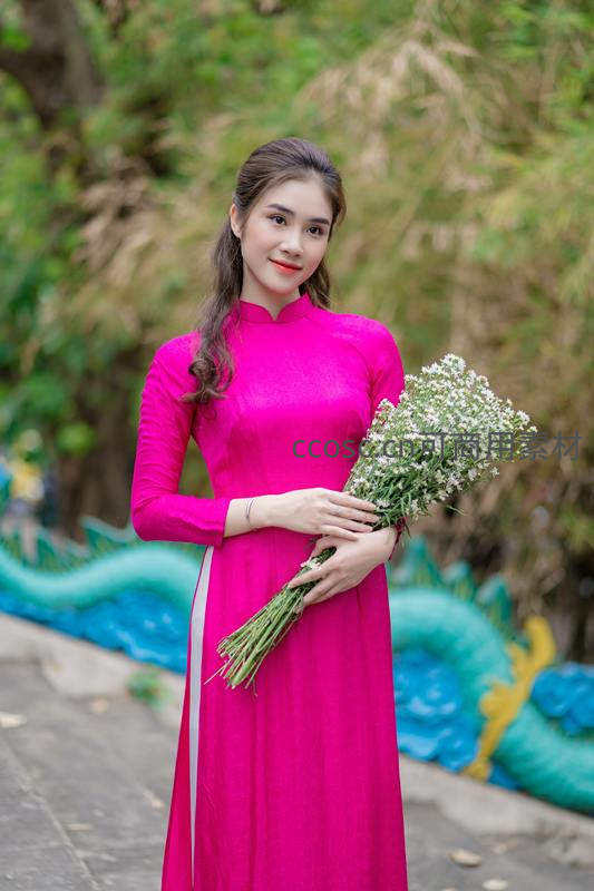 一位穿着鲜艳粉色奥黛的年轻女子,手捧一束小白花,站在色彩斑斓的龙形雕塑前,面带甜美微笑,充满春天的气息。