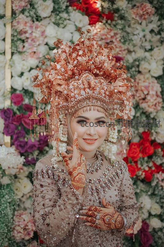 华丽头饰新娘笑靥如花,繁花背景衬托幸福时刻