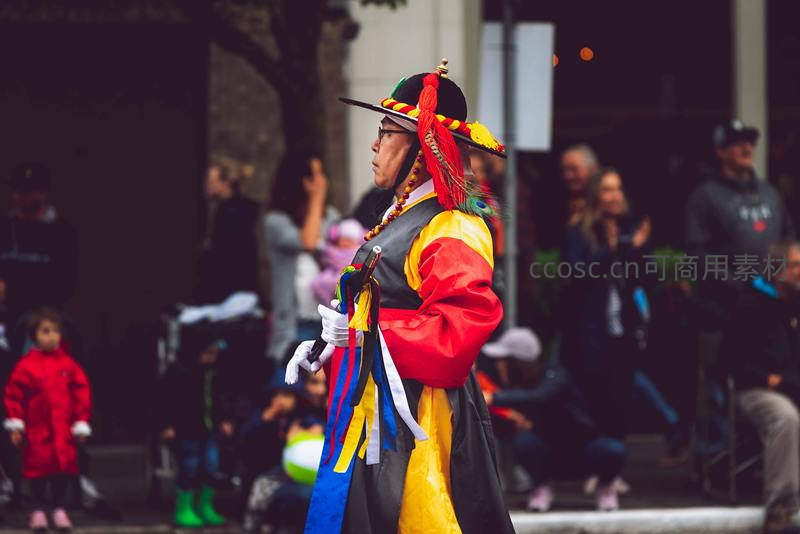 身着华丽传统韩服的表演者在街头巡游,头戴特色帽饰,手持彩带,吸引路人驻足观看,传递民族文化魅力。
