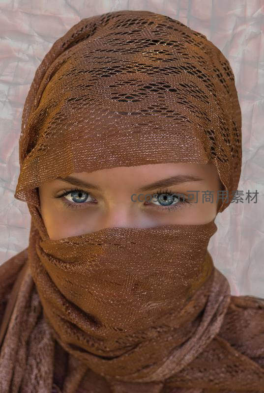 微距镜头下,女子蓝色眼眸穿透棕色蕾丝面纱凝视前方,神秘而深邃,背景朦胧,凸显面部细节与异域美感。