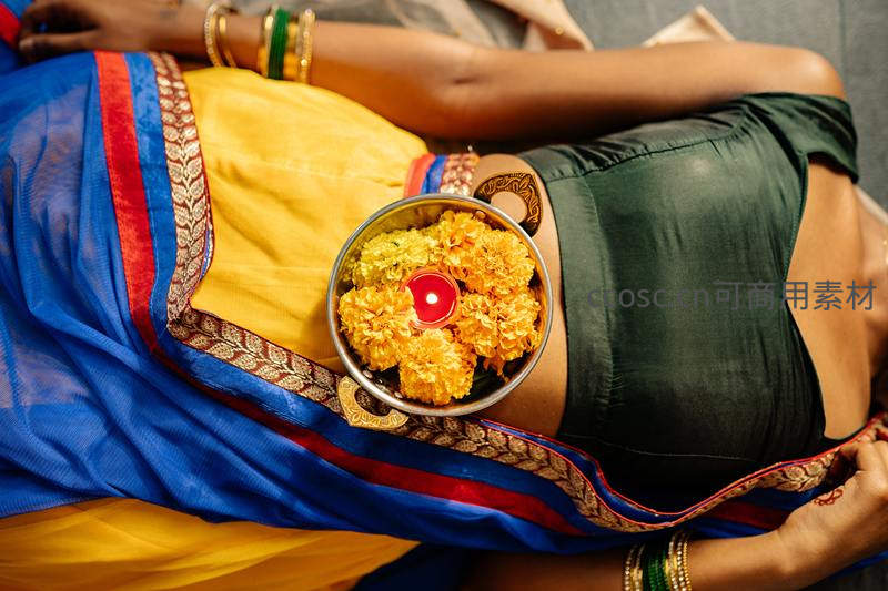 女子腹部托着盛满橙色万寿菊与红烛的金属盘,色彩温暖,氛围宁静,体现宗教或节庆仪式中的虔诚与美感。