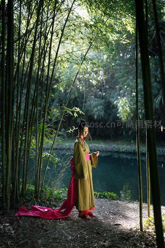 女子身着典雅古装立于幽深竹径,回眸浅笑,身后碧水如镜,阳光斑驳,构成一幅充满诗意与宁静之美的东方意境画卷。