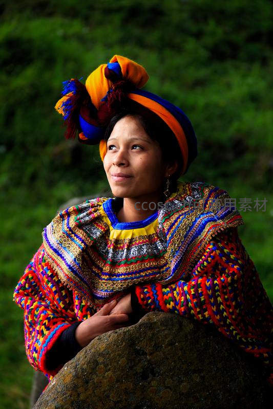 一位身着鲜艳多彩民族服饰的女子,头戴蓝橙相间的传统头巾,倚靠在岩石上凝望远方,背景是朦胧的绿色山林。