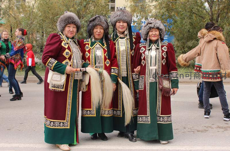 四位女士身着色彩鲜艳、图案精美的民族长袍与毛皮帽,在城市街道上微笑合影,背景有行人和绿树,展现浓郁的文化风情。