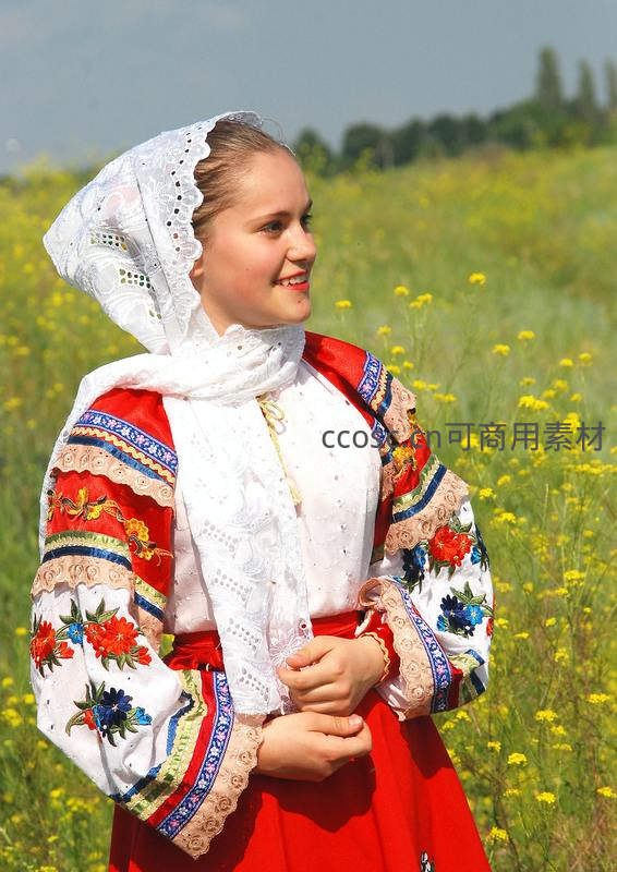 金发少女身着红白相间的传统刺绣长裙,头戴白色蕾丝头巾,站在开满黄花的田野中侧脸微笑,背景是晴朗天空与远树。