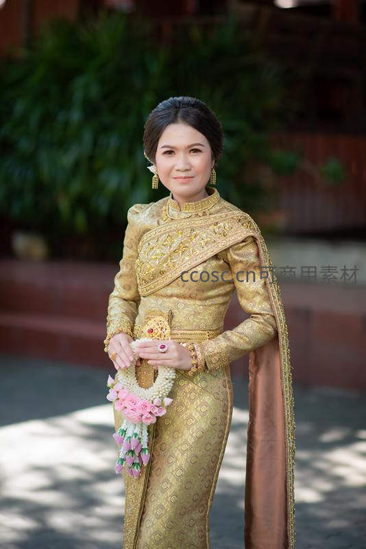 一位身着华丽金色泰式传统礼服的女子,面带温婉笑容,手捧精致花环,背景绿植朦胧,尽显东方古典韵味与庄重仪式感。