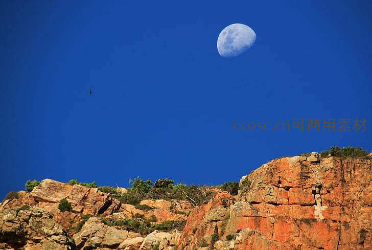 晴朗的蓝天之下,一弯清月高悬,与赭红色岩石山体形成鲜明对比,展现自然景观的壮丽与和谐。
