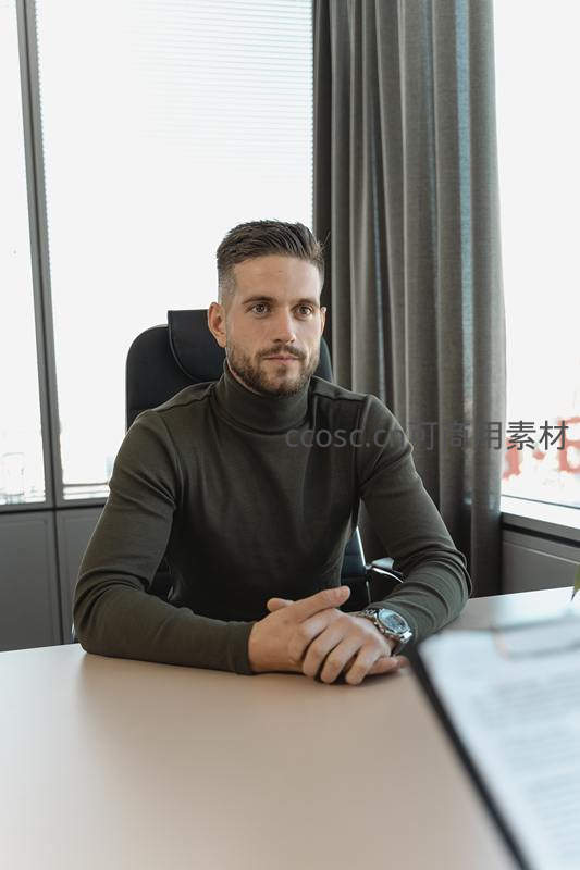 一位穿着深色高领衫的男士端坐于现代办公桌前,神情专注地凝视镜头,展现沉稳的职业风范。