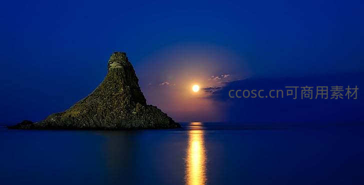 一座陡峭的海岛矗立于平静海面,满月从云后透出金光,在水面拉出一道长长的倒影,营造静谧而壮美的意境。