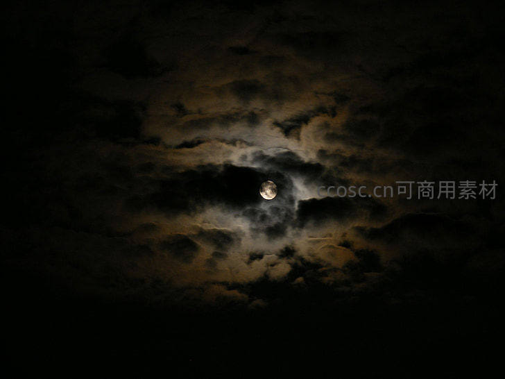 一轮明月从厚重的云层缝隙中透出光芒,营造出神秘而宁静的夜晚氛围。