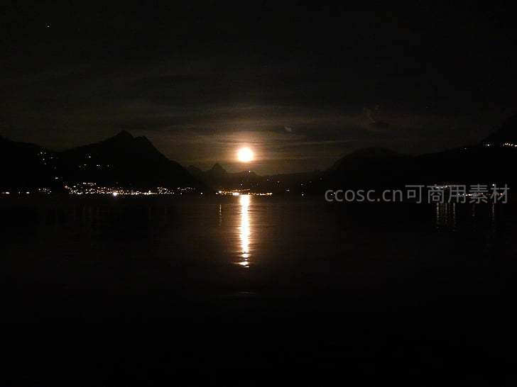 明亮的月光洒在平静的湖面上,形成一道耀眼的光路,远处山峦与灯火点缀其间。