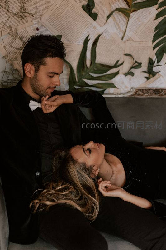 男女身着黑色礼服在沙发上亲密依偎,背景铺满书页与热带植物,营造出文艺、优雅且浪漫的氛围,适合婚礼或纪念日拍摄。