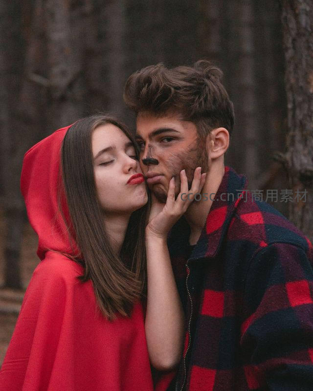 在幽深树林背景下,身披鲜红斗篷的女子轻吻男友脸颊,男友面带彩绘,画面如童话般梦幻,充满戏剧张力与浓烈爱意。