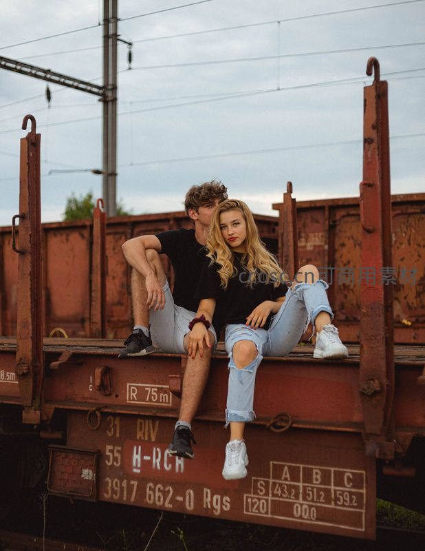 情侣坐在锈迹斑斑火车上
