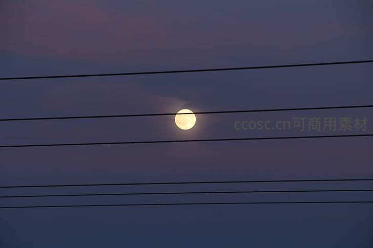 一轮圆月悬于暮色天空,几条电线横贯画面,构成城市生活中独特的视觉符号。