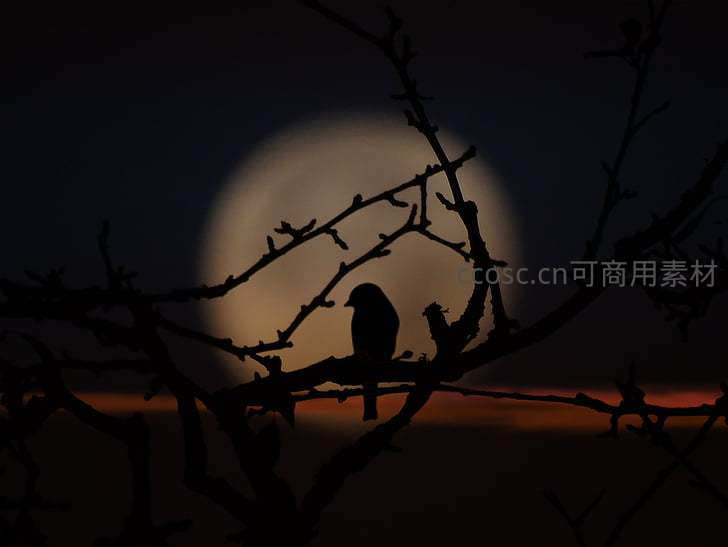 枝头鸟影衬托朦胧月光