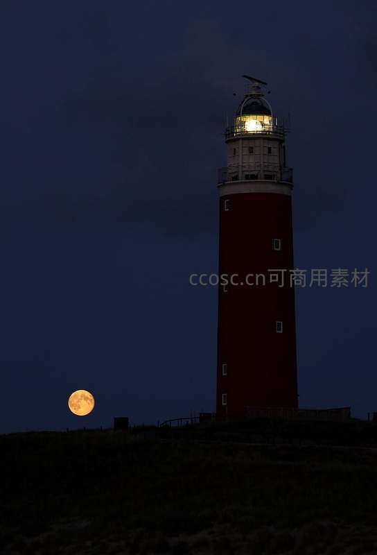 一座醒目的红色灯塔在夜幕下熠熠生辉,一旁圆月缓缓升起,海风轻拂,尽显海岸线的浪漫与守护。