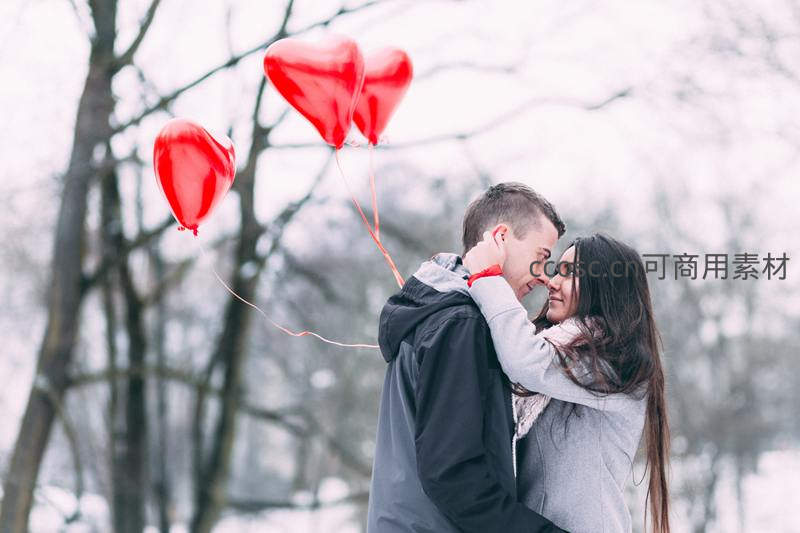 冬日雪地中,一对情侣相拥亲吻,三只红色爱心气球飘浮空中,为寒冷季节增添一抹温暖与节日般的甜蜜色彩。