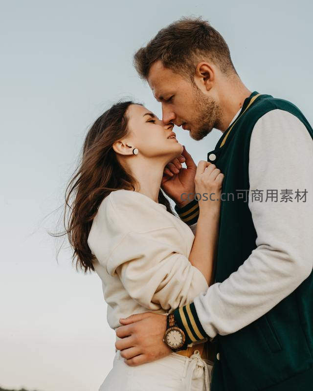 情侣深情对视,温柔相拥于晴空之下