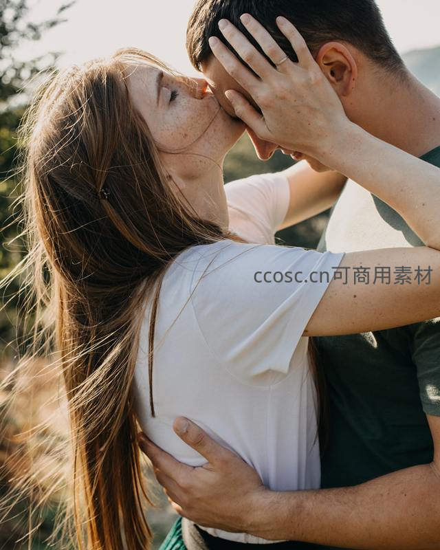 在明媚阳光下,一对情侣紧紧相拥并深情亲吻,女子长发飞扬,男子温柔抚摸其脸颊,氛围浪漫而甜蜜。
