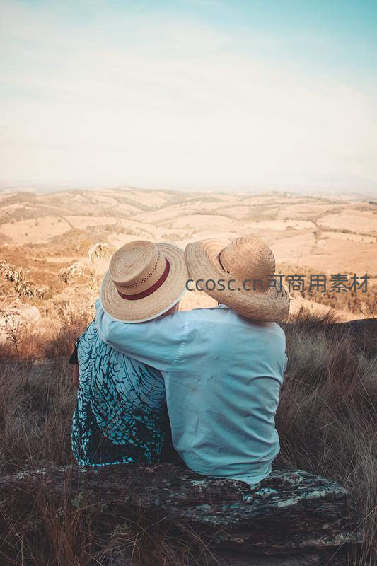 情侣戴草帽山顶远眺金色原野