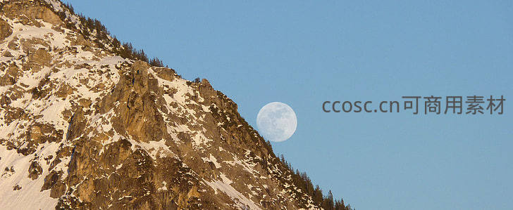 在白雪覆盖的陡峭山峰旁,一轮皎洁的满月静静悬挂在清澈的蓝天中,构成一幅纯净而壮美的高山月景。