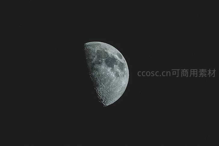 深邃的黑色夜空中,一弯清晰的半月静静悬挂,其表面的环形山和月海纹理纤毫毕现,展现出月球荒凉而神秘的面貌。