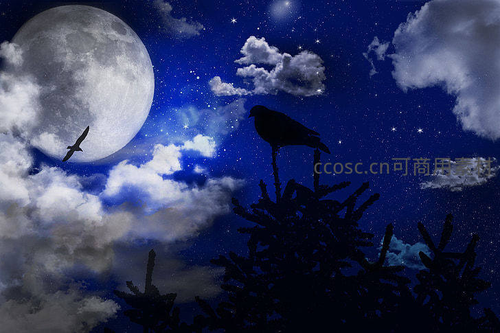 深蓝色的夜幕下,一轮明月被云层环绕,一只乌鸦栖息在树梢剪影上,另一只飞鸟掠过月面,营造出静谧而富有诗意的氛围。