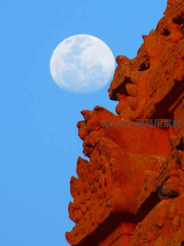 古建筑飞檐映衬皎洁明月,红墙蓝空