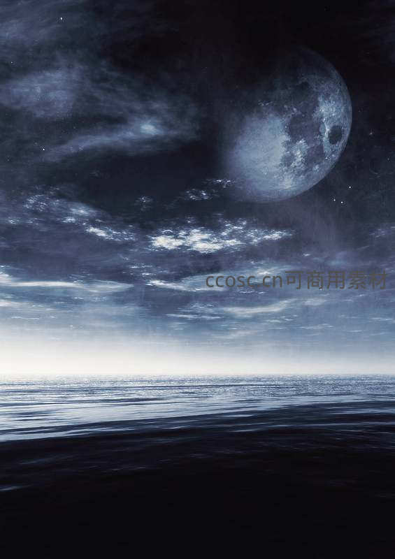 一轮巨大的月亮悬挂在幽暗的夜空,清辉洒向平静无垠的海面,薄云在月光下流动,整个场景显得苍茫、宁静而又如梦似幻。