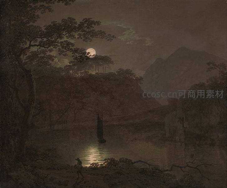 一轮明月高悬山巅,湖面波光粼粼,一叶扁舟静泊水中央,岸边行人缓步,营造出静谧诗意的夜晚氛围。