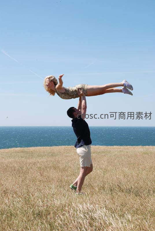 男子在海边金黄草地上将女友高高抛起,两人开怀大笑,碧海蓝天为背景,尽显自由与无拘无束的幸福。