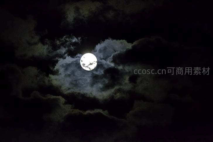 一轮明亮满月穿透厚重乌云,云朵边缘被月光勾勒出柔和轮廓,营造出神秘梦幻、引人遐想的夜空景象。