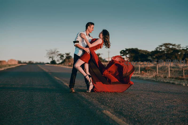一对情侣在空旷公路上翩翩起舞,女子红色长裙随风飞扬,蓝天与远山为背景,展现出自由与热烈的爱情画面。