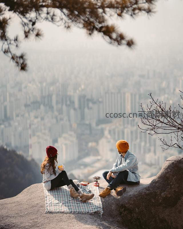 两人坐在山顶岩石上铺着格子毯野餐,背后是朦胧的城市天际线,松枝垂落前景,营造出远离喧嚣、享受宁静二人世界的画面。