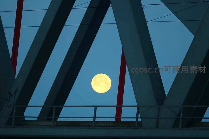 金黄色的满月透过现代桥梁的钢架结构完美呈现,形成独特的几何构图,展现了工业美学与自然之美的融合。
