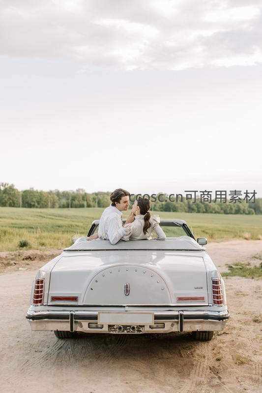 年轻情侣在白色经典敞篷车后座深情相拥亲吻,背景是辽阔田野与云天,充满自由与浪漫气息。