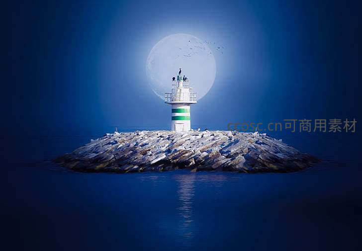 孤岛灯塔伴圆月