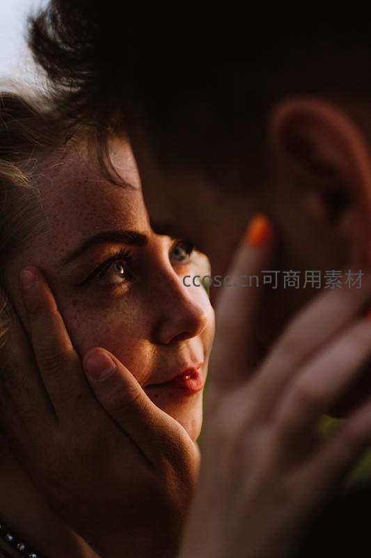 在温暖的逆光下,女子深情凝望,男子以指尖轻抚其脸颊,画面充满爱意与温柔,捕捉了恋人之间最私密动人的时刻。
