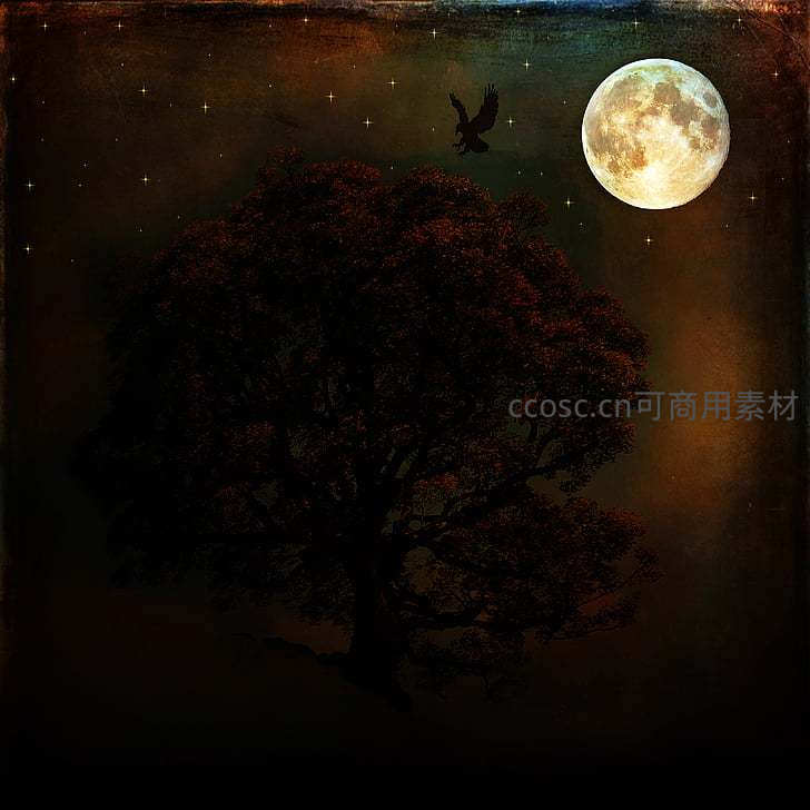 在布满星辰的夜空下,一只飞鹰掠过古老大树的剪影,旁边悬挂着一轮明亮的满月,充满奇幻与古典气息。
