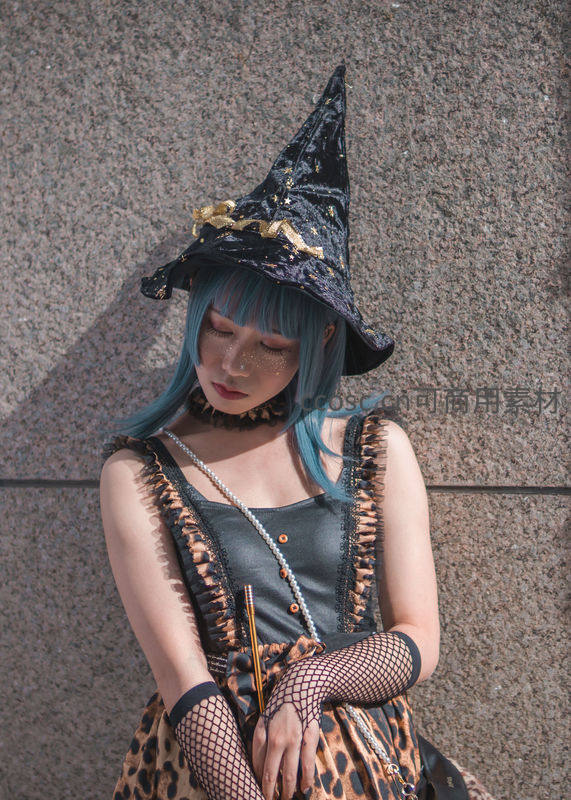 一位蓝发少女身着精致的女巫装束,头戴尖顶帽,倚靠在粗糙的石墙上,眼神低垂,呈现出神秘而宁静的奇幻美感。