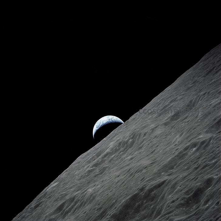 从月球表面仰望,地球如一颗蓝色宝石悬于漆黑天幕,展现宇宙间星球的壮美与孤寂。