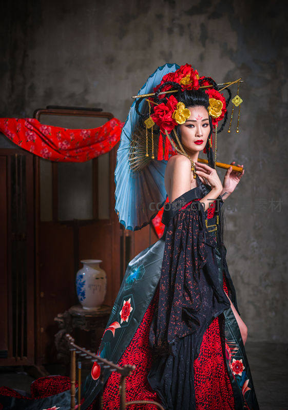 身着华丽红黑刺绣古装的女子,头戴繁复花饰与流苏,手持折扇和毛笔,神情优雅从容,背景为复古中式室内陈设,尽显东方古典韵味。