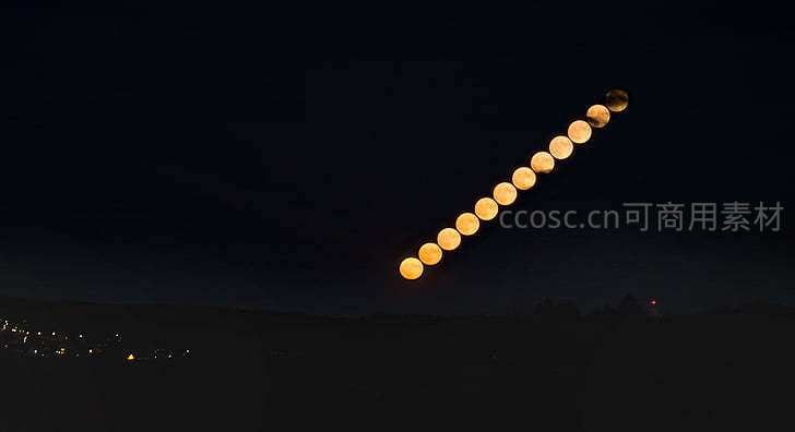 通过延时摄影捕捉月亮移动轨迹,形成一串璀璨金珠,优雅划过城市上空的深邃夜幕。