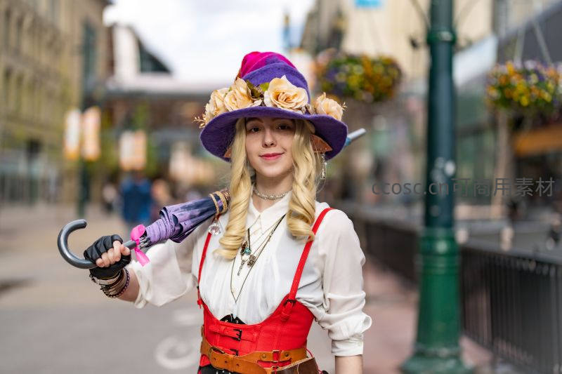 金发少女身着复古红背带装,头戴缀满花朵的紫色宽檐帽,手持折叠伞,于欧洲风情街道上微笑回眸,背景建筑与花篮点缀出童话氛围。