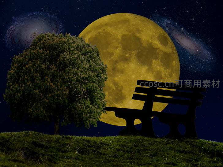 星空下长椅静候超大金黄满月