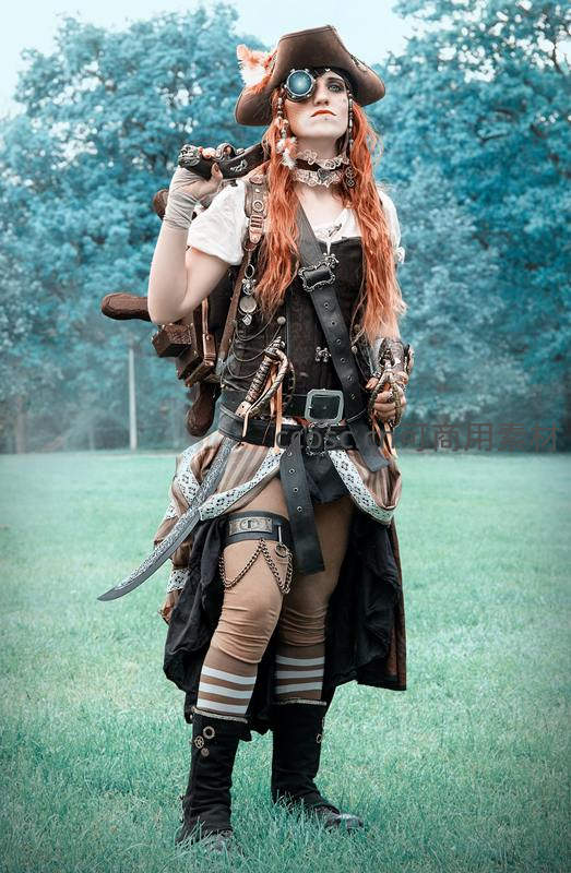 红发女海盗持剑立于青草地,蒸汽朋克风十足