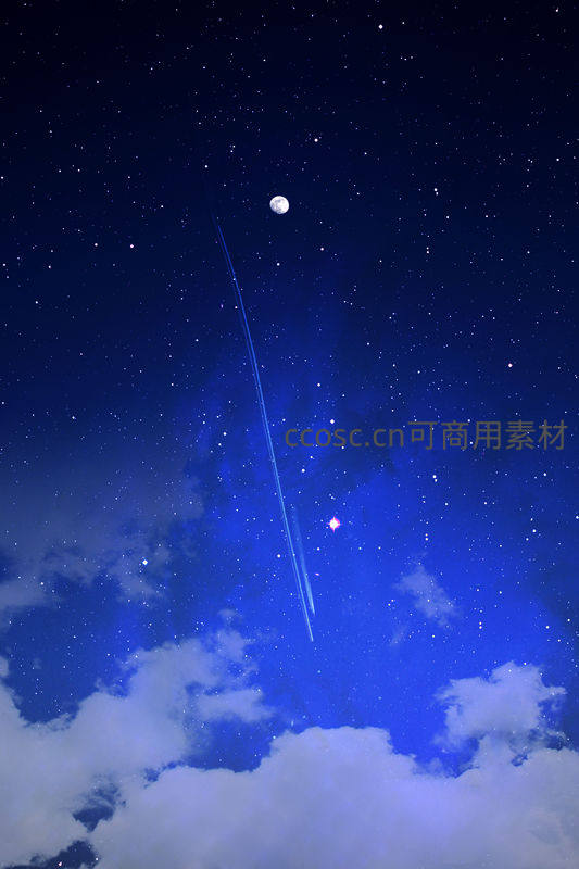 一道耀眼的流星拖着长长的尾迹划过布满繁星的深蓝色夜空,一旁的月亮静静悬挂,下方是柔和的白色云层。